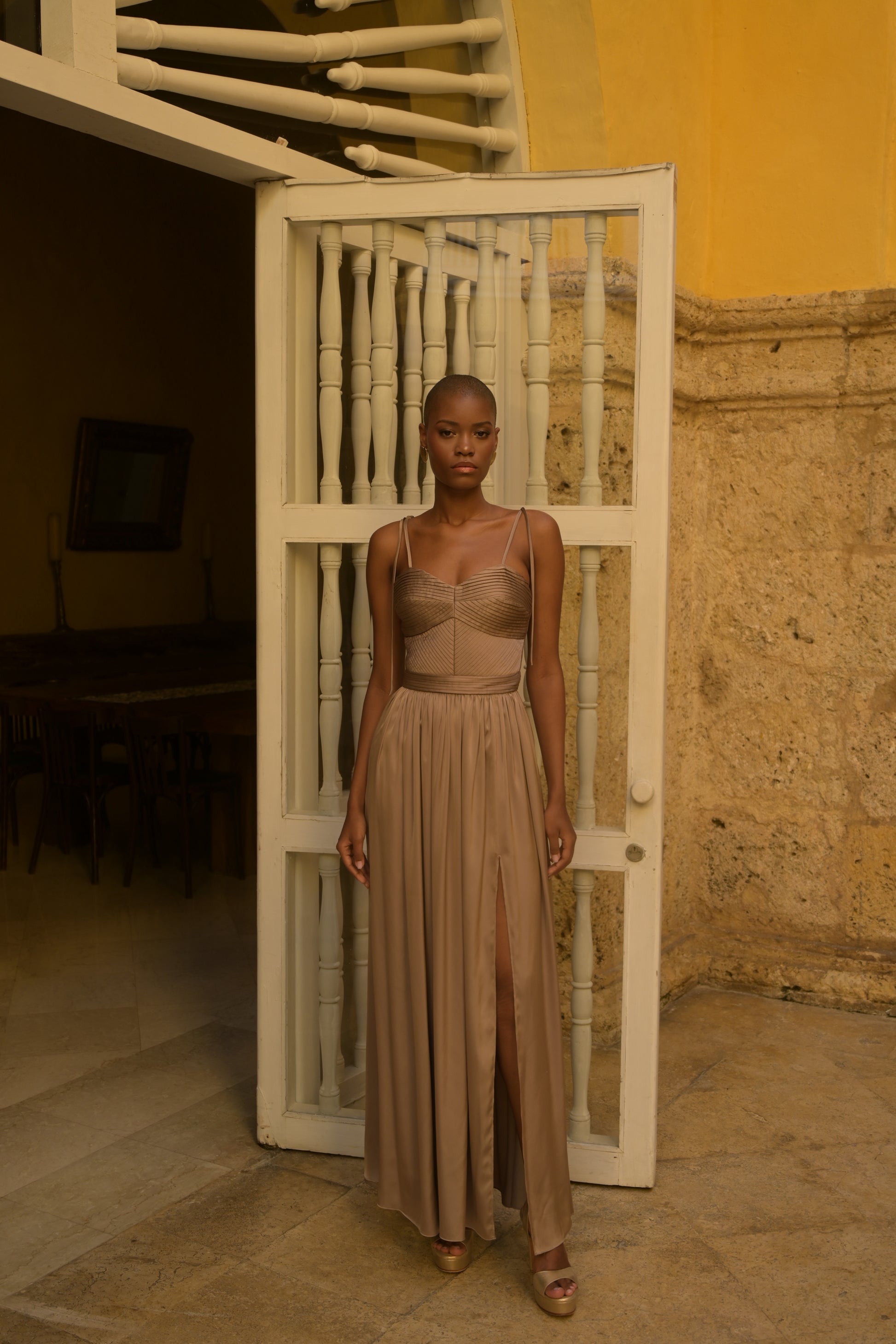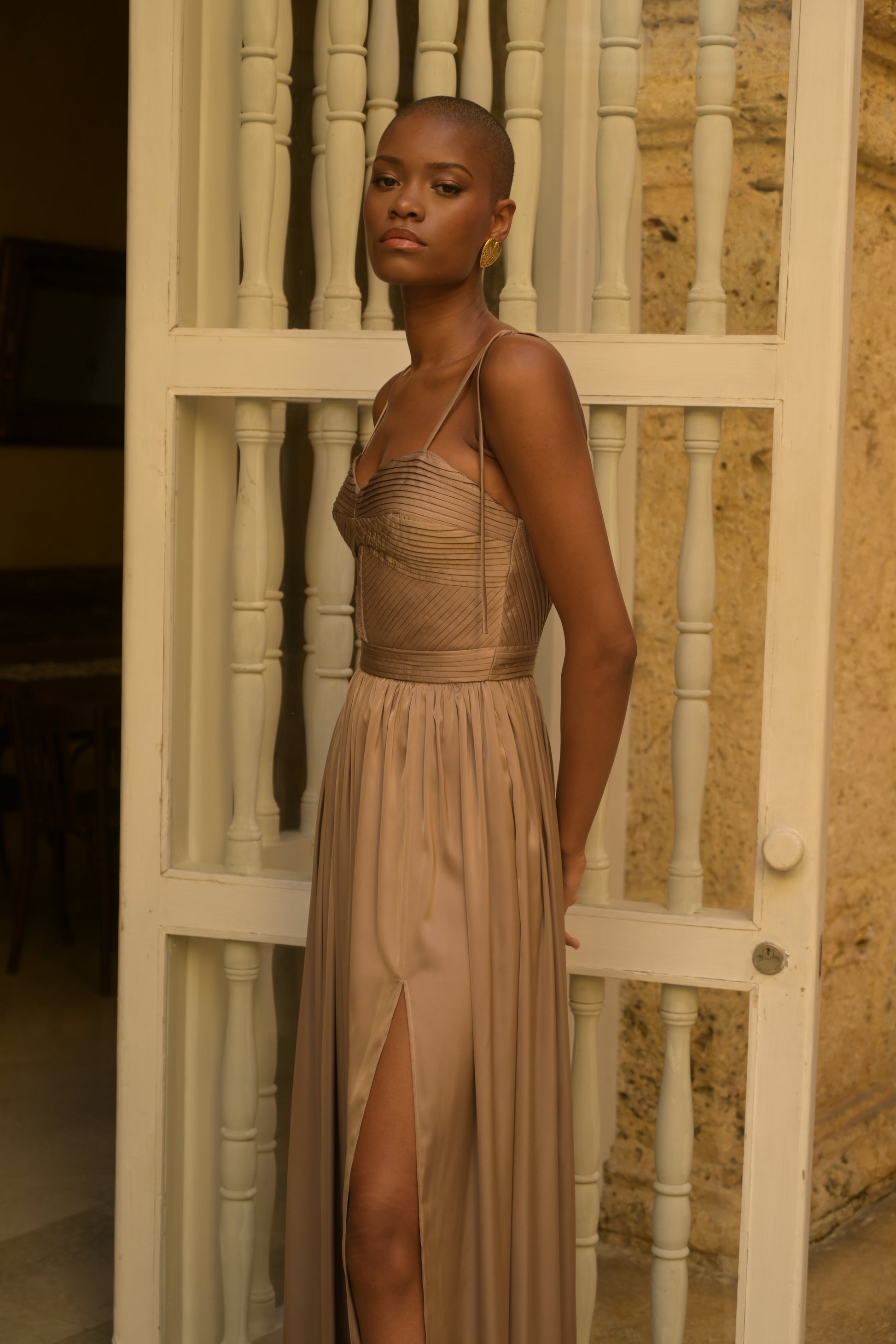LONG DRESS WITH PLEATED TOP IN SATIN TAUPE