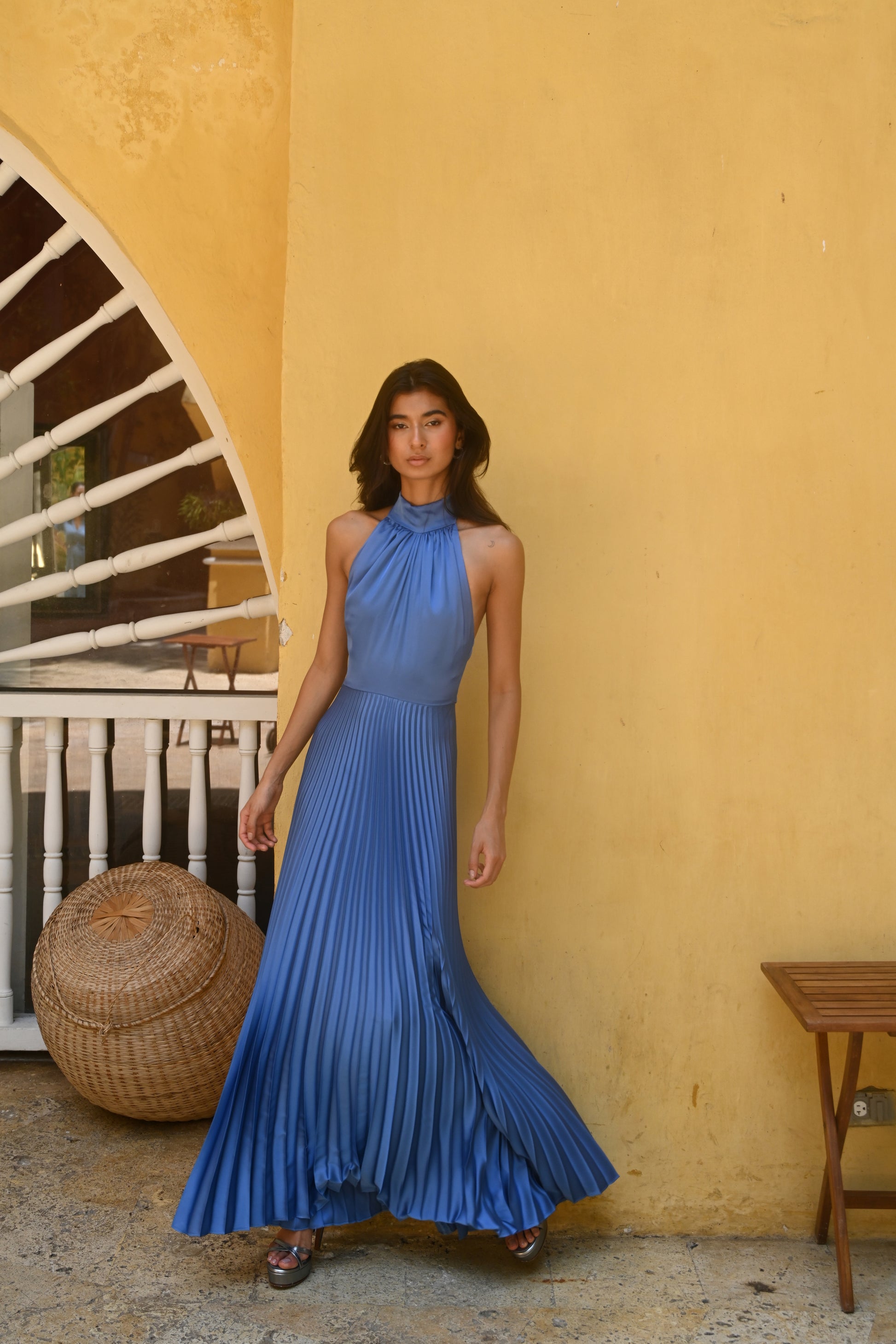 LONG DRESS WITH HALTER NECK AND PLEATED SKIRT IN BLUE COBALT
