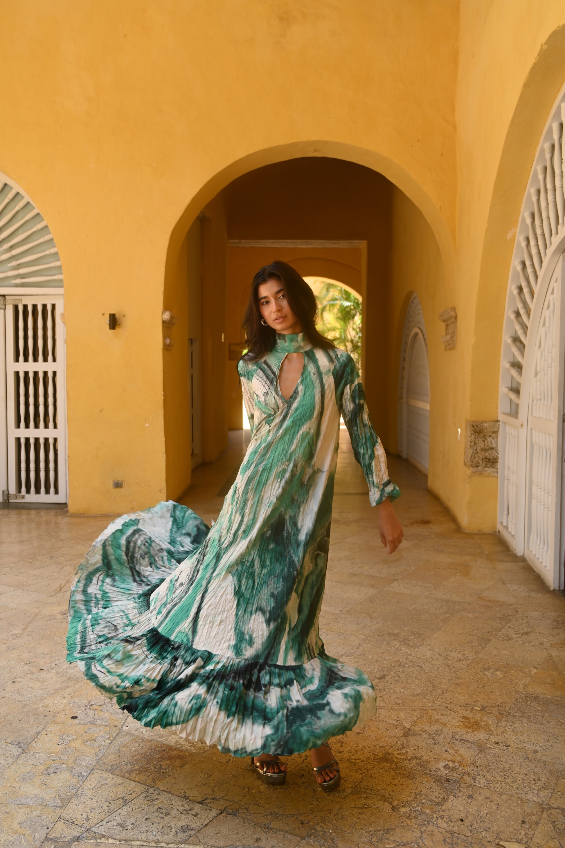 LONG DRESS WITH LONG SLEEVES AND GREEN AND BEIGE ABSTRACT PRINT